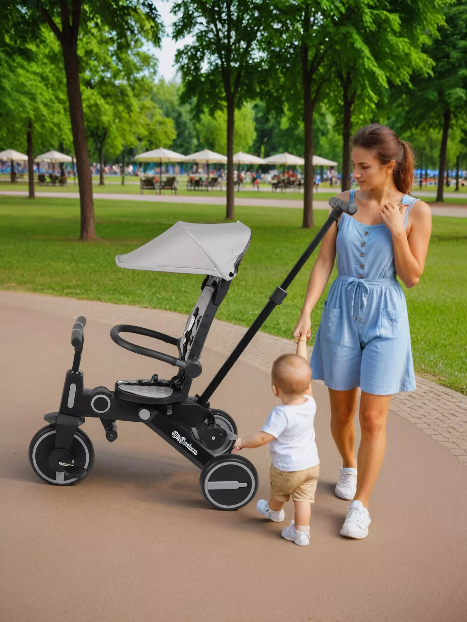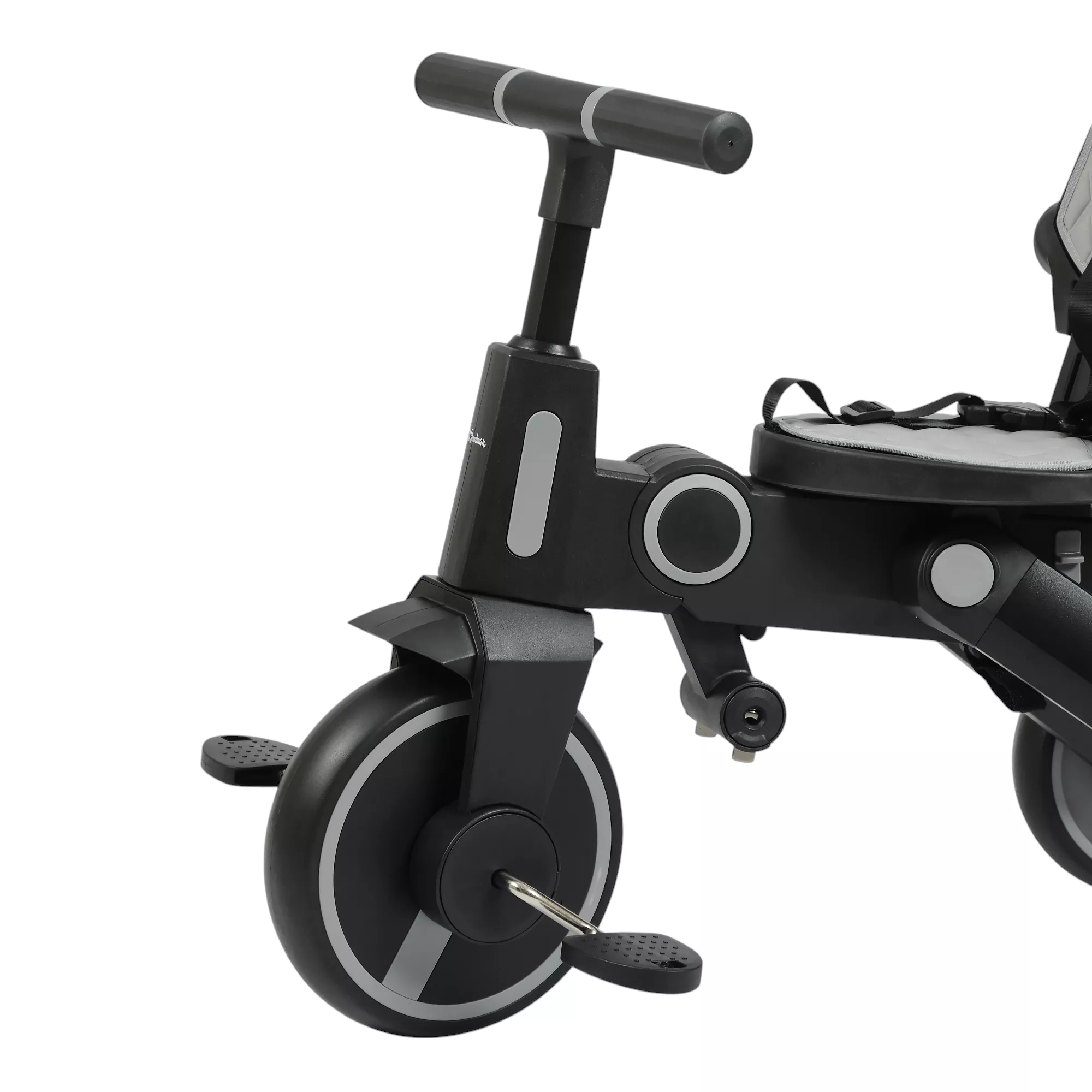 Велосипед имеет прочную и легкую алюминиевую раму, складную крышу колясочного типа, новую форму пластиковых подножек для малышей, эргономичную родительскую ручку управления регулируется по высоте и позволяет с легкостью управлять велосипедом за счет поворота переднего колеса. Комфорт малышей прежде всего - мягкое поворотное сиденье на 360 градусов: лицом к маме и лицом по ходу движения. Сиденье легко разворачивается. Трехточечный ремень безопасности обеспечивает максимальную и комфортную фиксацию ребенка. Колеса из пластика и резины диаметром 8 и 7 дюймов, надежные и прочные. Современный дизайн дисков. Свободный ход переднего колеса, чтобы ребенок мог отдохнуть, велосипедом при этом управляет взрослый. Классический тормоз задних колес для безопасной стоянки. Съемный бампер и педали.