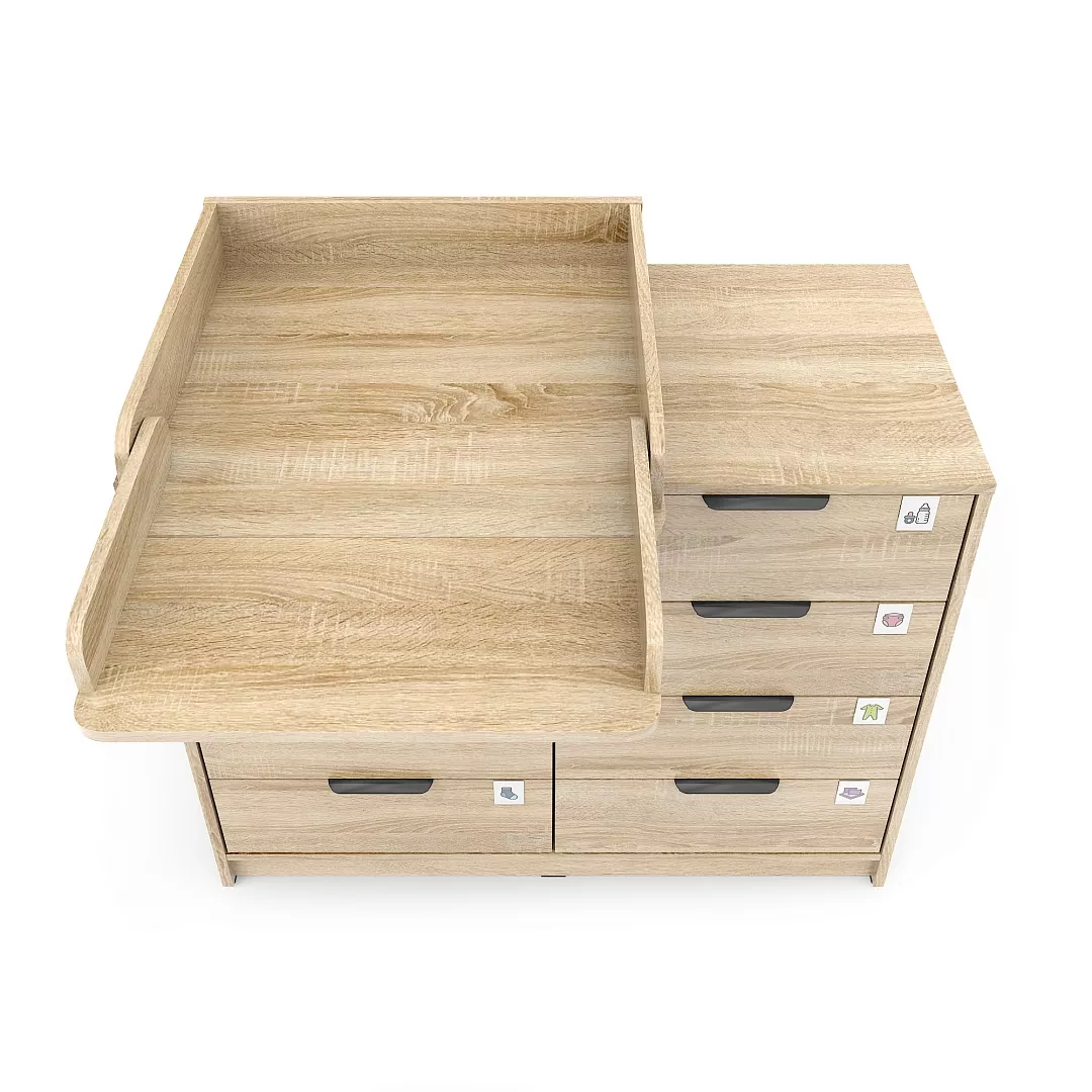 Пеленальный столик снимается и устанавливается одним простым движением, не оставляя никаких следов на столешнице, при этом надежно фиксируется через специальные металлические втулки в задний торец столешницы. Его можно установить в 3 положения - слева, справа и по центру комода. Тем самым, вы сами определяете, с какой стороны останется место для средств по уходу за малышом.