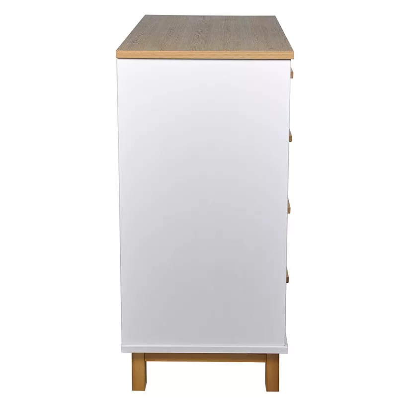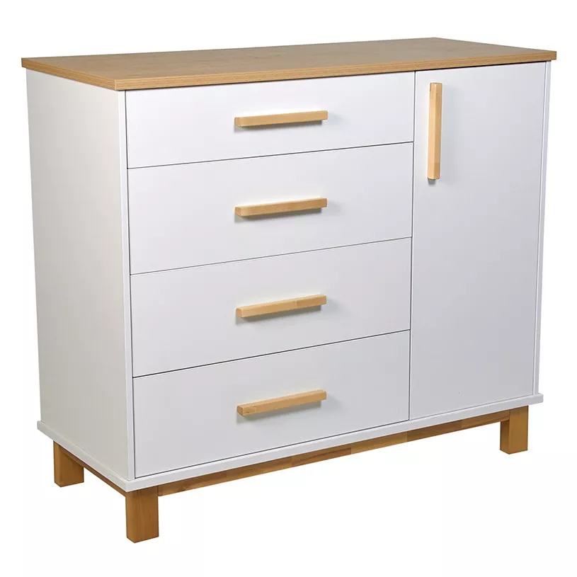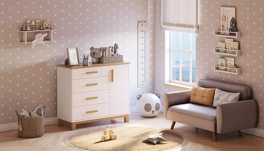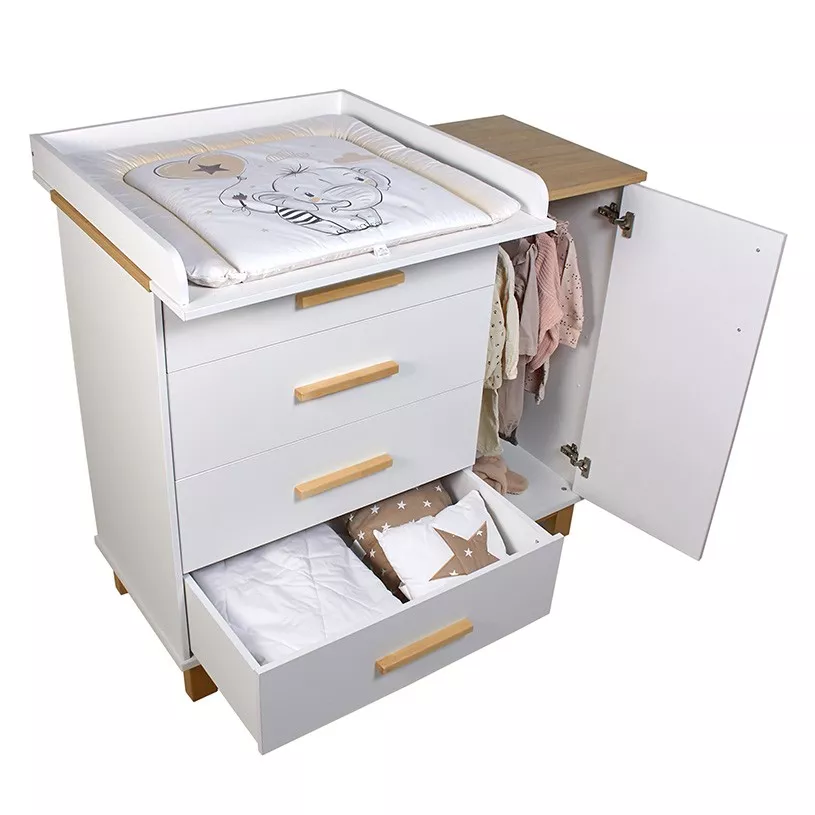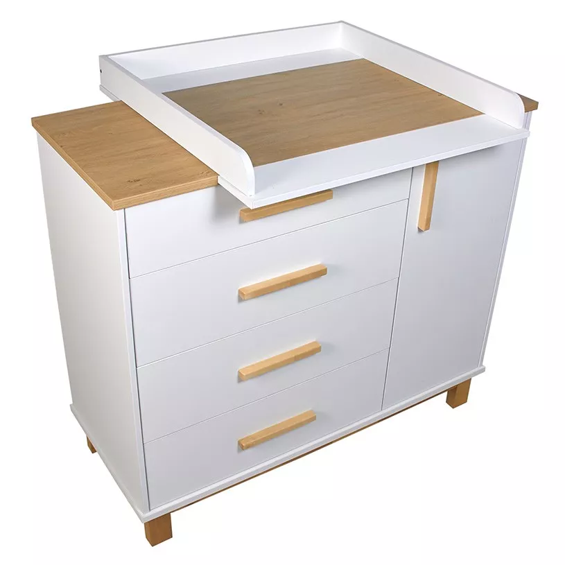 Комод имеет продуманную конструкцию, обеспечивающую функциональность при использовании, и при этом не выглядит громоздко благодаря высоким опорам. Изделие подходит для пеленания малышей благодаря возможности установки универсальной пеленальной рамы с бортиками, которая гарантирует удобство в уходе за ребенком и безопасность.