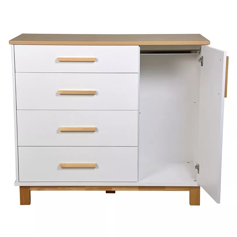 Комод 3403 Simple помимо ящиков оснащен секцией со штангой для одежды, в которой детские вещи будут аккуратно развешены и даже останется место для хранения внизу. Если надобности в использовании штанги нет, то в данный отсек можно установить полочку (идет в комплекте), которая регулируется по высоте, тем самым увеличивая зону для хранения, ведь детских вещей никогда не бывает мало.